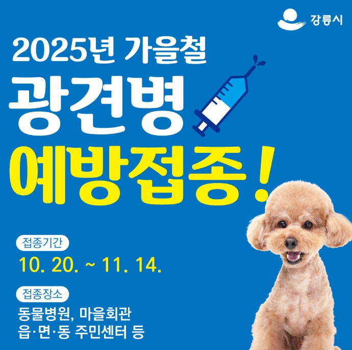 [파이낸셜경제=조성환 기자] 강릉시는 인수공통전염병으로 알려진 광견병으로부터 시민과 반려동물을 안전하게 보호하기 위해 오는 10월 20일부터 11월 14일까지 4주간 가을철 광견병 예방접종을 실시한다.