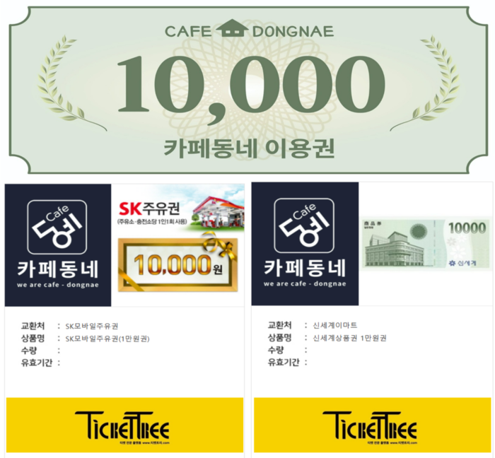 한편 카페동네 관계자는 이번 이용권 발행과 함께 티켓트리와 업무 제휴를 통해 “카페동네 파트너 전용” 1만 원권 주유권, 백화점상품권 등을 카페동네 파트너들에게 93%에 판매 및 공급을 한다고 전했다.