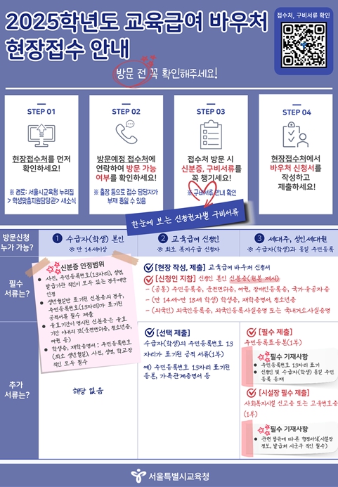 [파이낸셜경제=김예빈 기자] 서울특별시교육청은 2025년 12월 2일부터 12월 12일까지, 2025학년도 교육급여 바우처 미신청자 중 온라인 신청이 어려운 대상을 위해 한시적 현장 접수를 운영한다고 밝혔다.