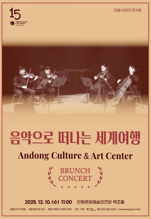 [파이낸셜경제=김지훈 기자] 안동문화예술의전당은 매월 둘째 주 수요일, 바쁜 일상 속 잠시 여유를 찾고자 하는 클래식 애호가들을 위한 브런치 콘서트를 정기적으로 운영하고 있다. 12월 10일 오전 11시에는 백조홀에서 한 해의 끝자락을 따뜻하게 채워줄 브런치 콘서트 ‘음악으로 떠나는 세계여행’을 선보인다.