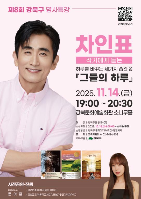 이순희 강북구청장은 “차인표 작가의 강연을 통해 구민 여러분이 삶의 의미를 돌아보고 서로에게 건네는 작은 위로의 가치를 되새기는 시간이 되기를 바란다”며 “앞으로도 다양한 분야의 명사들과 함께하는 배움과 소통의 자리를 꾸준히 이어가겠다”고 말했다.