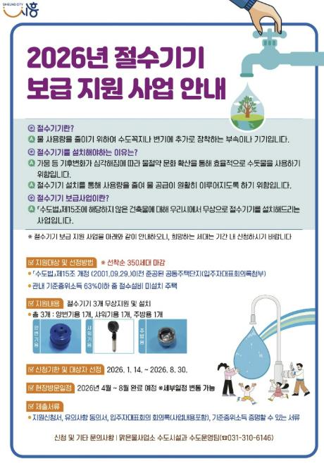[파이낸셜경제=김기보 기자] 시흥시는 물 절약 문화를 확산하기 위해 ‘2026년 절수기기 보급 지원사업’을 본격적으로 추진한다. 올해는 작년보다 지원 대상을 넓혀 관내 저소득 취약계층까지 총 350세대에 가구당 절수기기 3종(양변기용ㆍ주방용ㆍ샤워기용)을 무상으로 지원한다.