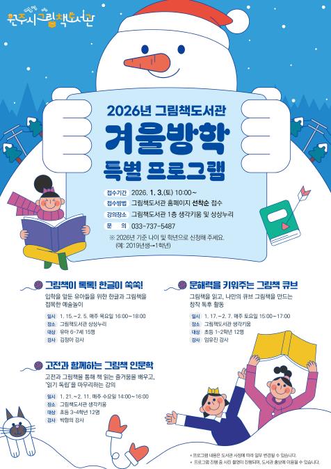 [파이낸셜경제=조성환 기자] 원주시 그림책도서관은 겨울방학을 맞은 어린이를 대상으로 특별 프로그램을 운영한다.