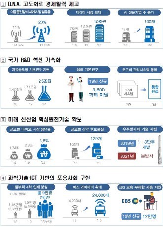 이에 따라 5G 세계최초 상용화로 글로벌 시장을 선점하고, R&D 20조 원 투자로 혁신성장 선도와 국민의 삶의 질 제고, 그리고 4차 산업혁명에 대응하는 혁신인재 양성과 맞춤형 국민지원 강화라는 3대 전략을 중점 추진할 계획이다.