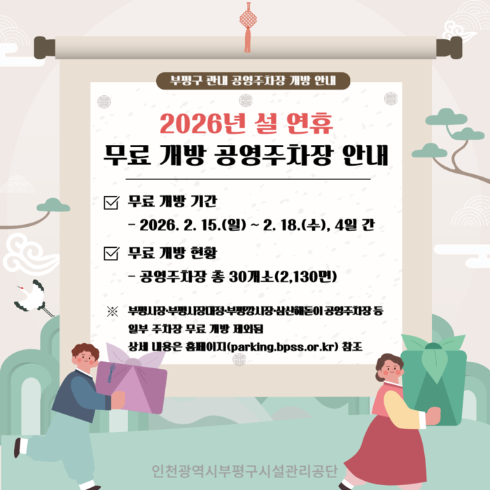 [파이낸셜경제=김기보 기자] 인천광역시부평구시설관리공단(이사장 윤낙영, 이하 ‘공단’)이 설 명절을 맞이하여 연휴 기간인 2월 15일부터 18일까지 4일간 부평구 내 공영주차장 30개소를 무료 개방한다고 밝혔다.