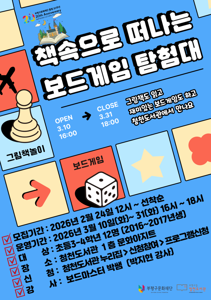이번 프로그램은 초등학교 3~4학년(2016~2017년생)을 대상으로 하며, 10일부터 31일까지 매주 화요일(오후 4시~6시) 청천도서관 1층 문화아지트에서 진행된다. 책 읽기 활동과 연계한 보드게임 체험을 통해 독서에 대한 흥미를 높이는 놀이형 독서 프로그램이다.