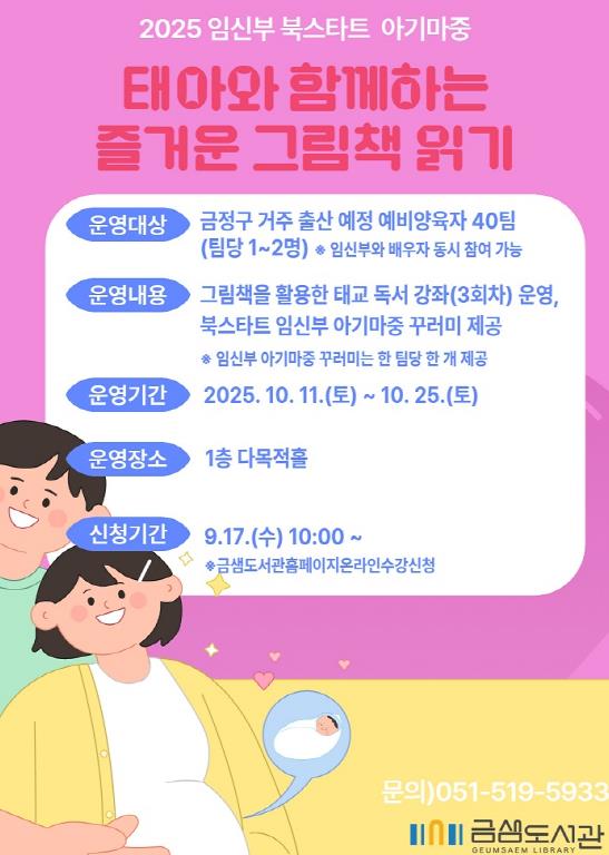 금샘도서관에서는 '태아와 함께하는 즐거운 그림책 읽기' 프로그램으로 운영되며‘좋은 태교 그림책 고르는 기준' 등 태교독서 강좌(3차시)와 임산부 아기마중 책 꾸러미 제공 등으로 구성된다.