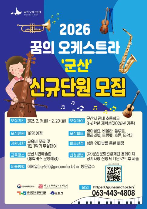 [파이낸셜경제=김예빈 기자] (재)군산문화관광재단이 ‘2026 꿈의 오케스트라 군산’과 함께 할 신규단원을 오는 20일까지 공개 모집한다.