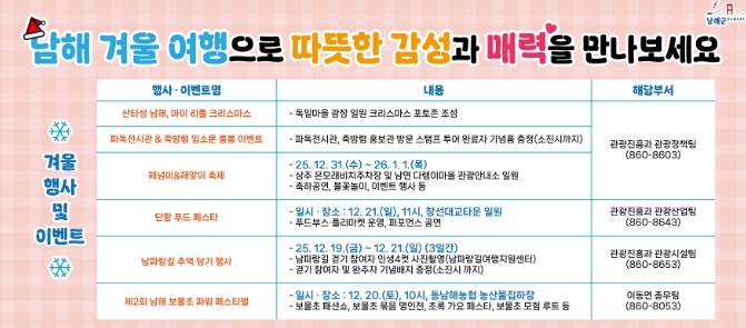 [파이낸셜경제=김예빈 기자] 남해군은 겨울 여행 관광객 유치와 체류형 관광 활성화를 위하여 다양한 매력적인 행사 ․ 이벤트를 개최한다.