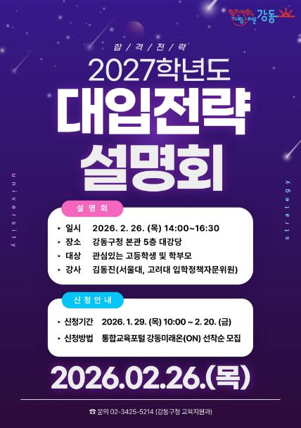 [파이낸셜경제=김예빈 기자] 서울 강동구가 2027학년도 대학입학전형에 대비한 올해 첫 대입전략설명회를 오는 2월 26일 강동구청 5층 대강당에서 개최한다고 28일 밝혔다.