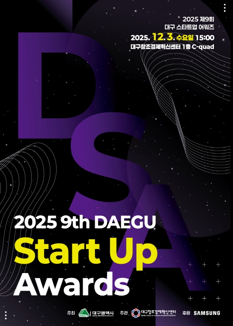 [파이낸셜경제=김지훈 기자] 대구광역시는 12월 3일 오후 3시, 대구창조경제혁신센터 C-quad(1층)에서 ‘제9회 대구스타트업어워즈’를 개최하고, 지역 창업생태계를 빛낸 우수 스타트업 10개사와 창업지원 유공자 2명을 시상한다.