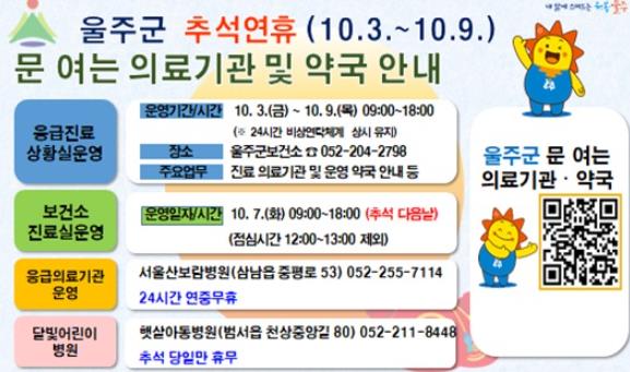 울주군 지역응급의료기관인 ‘서울산보람병원’은 24시간 응급의료진료가 가능하며, 달빛어린이병원인 ‘햇살아동병원’은 추석 당일을 제외한 나머지 기간 오전 9시부터 오후 6시까지 소아와 성인을 대상으로 운영한다.