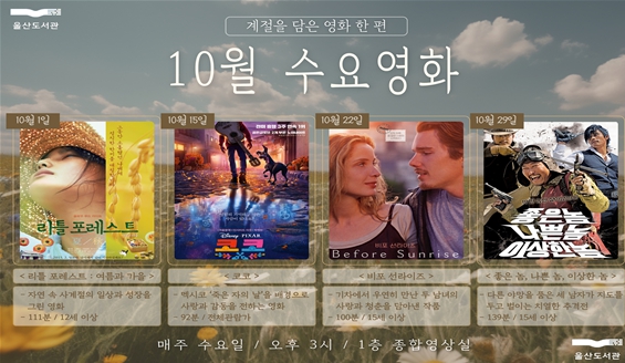 [파이낸셜경제=김예빈 기자] 울산도서관이 10월 한 달간 매주 수요일 오후 3시 도서관 1층 종합영상실에서 ‘계절을 담은 영화 한 편’을 주제로 영화를 상영한다.