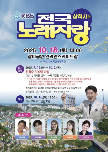 삼척시 관계자는 “전국민이 함께하는 프로그램인 KBS 전국노래자랑이 삼척시민들의 화합과 소통의 장이 되기를 바란다”고 말했다.
