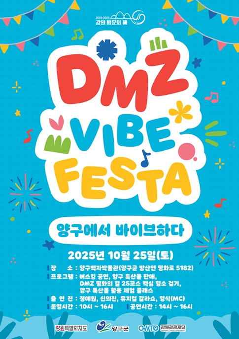 [파이낸셜경제=조성환 기자] 강원관광재단이 강원특별자치도, 양구군과 함께 오는 10월 25일 양구군 백자박물관 잔디마당에서 ‘디엠지 감성 축제(DMZ VIBE FESTA) 양구에서 바이브하다’를 개최한다고 밝혔다.
