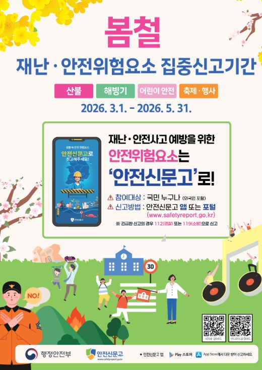 집중신고 대상은 △산불로 인한 산림 및 인근 지역 피해 위험 △해빙기로 인한 절개지·옹벽·축대 등 붕괴 위험 △등·하굣길, 놀이터, 학원 주변 등 어린이 안전 위험요소 △봄철 각종 축제·행사장에서의 인파 밀집, 전기·가스 안전사고 등 봄철에 특히 취약한 각종 재난위험요소가 포함된다.