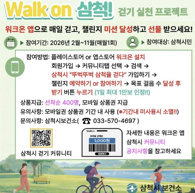 [파이낸셜경제=조성환 기자] 삼척시는 시민들의 건강 증진과 일상 속 걷기 실천율 향상을 위해 모바일 걷기 앱 '워크온(Walk On)'을 활용한 ‘워크온 걷기 챌린지’를 오는 2월부터 11월까지 운영한다.