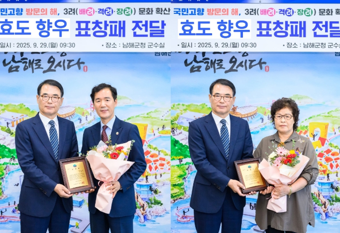 [파이낸셜경제=김예빈 기자] 남해군은 9월 29일 군청 대회의실에서 ‘효도 향우 표창패 전달식’을 열고, 고향을 잊지 않고 부모님을 모시며 3려 문화 확산과 고향사랑 실천에 기여한 향우에게 표창패를 전달했다.