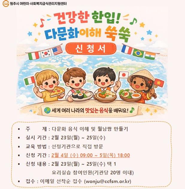 [파이낸셜경제=조성환 기자] 원주시어린이·사회복지급식관리지원센터는 오는 23일부터 25일까지 3일간 특화사업인 ‘쑥쑥 요리교실’을 운영한다.