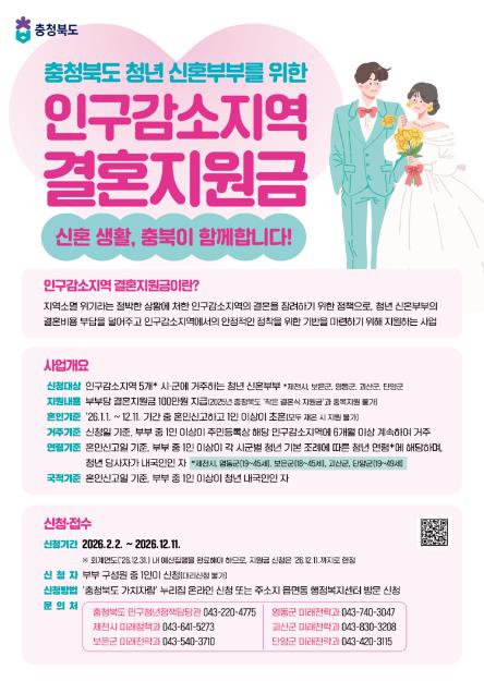 신청 기간은 오는 12월 11일까지며 요건을 갖춘 신혼부부는 ‘충청북도 가치자람’ 홈페이지를 통해 온라인으로 신청하거나 주소지 관할 읍·면 사무소를 방문해 신청하면 된다.