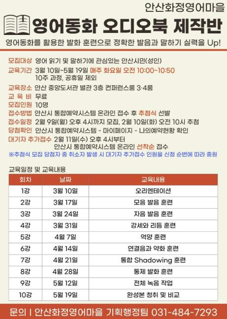 [파이낸셜경제=김기보 기자] 안산시가 설립하고 안산대학교가 운영하는 안산화정영어마을이 성인 영어 학습자를 위한 ‘영어동화 오디오북 제작반’을 3월부터 5월까지 10주 과정으로 안산시 중앙도서관에서 운영한다고 4일 밝혔다.