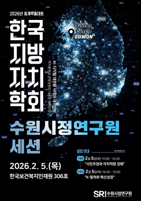 [파이낸셜경제=김기보 기자] 수원시정연구원은 오는 2월 5일(목) 충북 청주 오송 한국보건복지인재원에서 열리는 2026년 한국지방자치학회 동계학술대회에서 수원시의 대표 혁신 정책과 미래 성장 전략을 주제로 한 세션을 개최한다고 2월 2일 밝혔다.