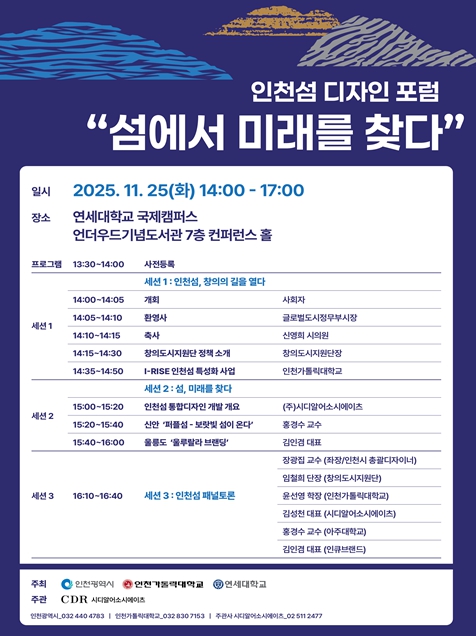 [파이낸셜경제=김기보 기자] 인천광역시는 오는 11월 25일 연세대학교 국제캠퍼스에서『인천섬 디자인 포럼』을 개최한다고 밝혔다.