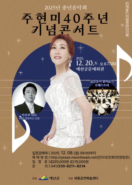[파이낸셜경제=김영란 기자] 예산군문예회관은 2025년 송년을 맞아 오는 12월 20일 오후 7시 ‘트롯 여제’ 주현미의 데뷔 40주년을 기념하는 콘서트를 개최한다.