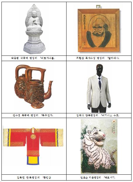 박종병 석공예 명장의 ‘비로자나불’, 최환갑 목재수장 명장의 ‘달마대사’, 권수경 목공예 명장의 ‘목주전자’, 김태식 양복 명장의 ‘비지니스 슈트’, 김복연 한복 명장의 ‘홍원삼’, 임호순 미용 명장의 ‘백호서기’ 등 전통문화를 계승한 재현 작품부터 현대 감각에 맞게 제작한 명품까지, 명장들의 과거와 현재를 아우르는 숭고한 장인정신과 인내의 숨결을 감상할 수 있다.