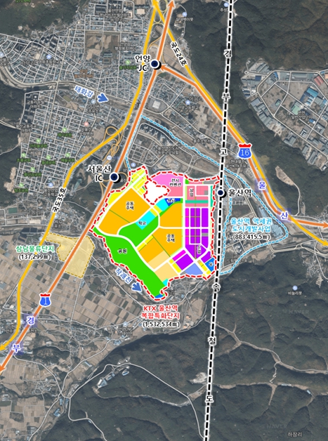 지난 8월 산업통상자원부로부터 경제자유구역으로 공식 지정된 ‘케이티엑스(KTX)울산역 복합특화단지’는 울주군 삼남읍 일원 153만㎡ 부지에 1조 600억 원을 투입해 조성된다.