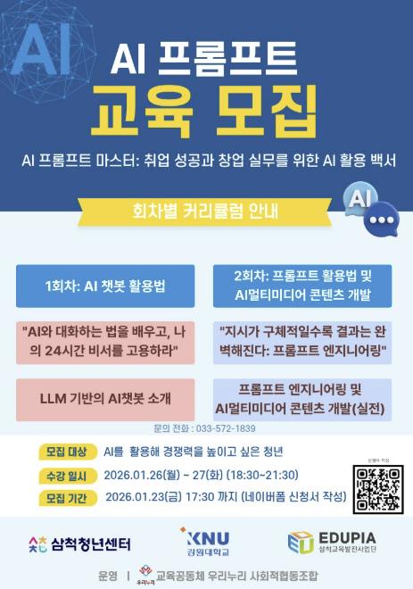[파이낸셜경제=조성환 기자] 삼척청년센터는 삼척교육발전사업단(EDUPIA)와 함께 AI 기술을 활용한 취업·창업 실무 역량 강화를 위해 ‘AI 프롬프트 교육과정’을 개설하고 참여자를 모집한다.