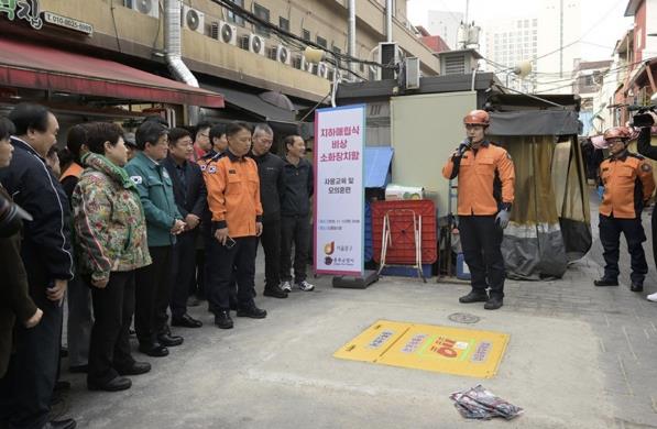 | ▲ 전통시장 지하 매립식 비상소화장치함 사용교육 사진 |