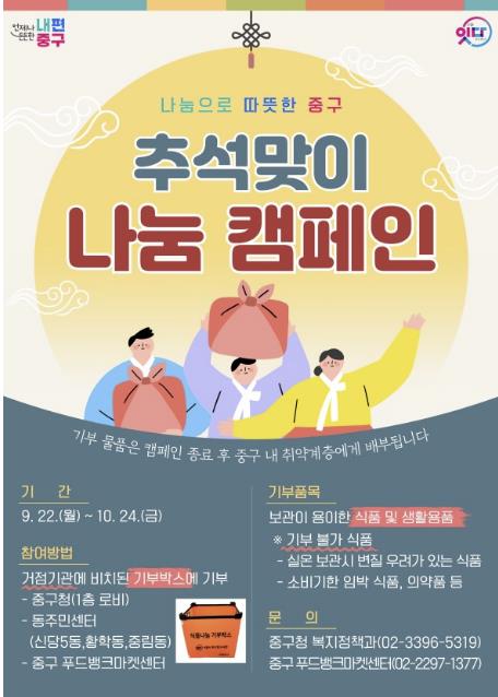 [파이낸셜경제=김예빈 기자] 서울 중구가 다가오는 추석 명절을 앞두고 어려운 이웃을 돕기 위해 '2025 추석맞이 나눔 캠페인'을 진행한다. 이번 캠페인은 지난 22일부터 오는 10월 24일까지 4주간 이어지며, 주민들의 따뜻한 동참으로 풍성한 명절 나눔을 실천할 예정이다.