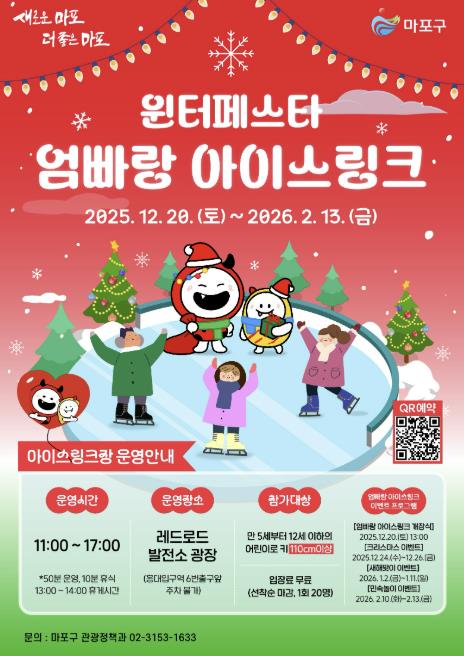 박강수 마포구청장은 “얼음 위 스케이트 자국마다 아이들의 웃음과 추억이 새겨지길 바란다”라며 “마포구는 계절마다 새로운 경험을 정성껏 마련해 주민의 삶을 더욱 풍성하게 만들겠다”라고 말했다.