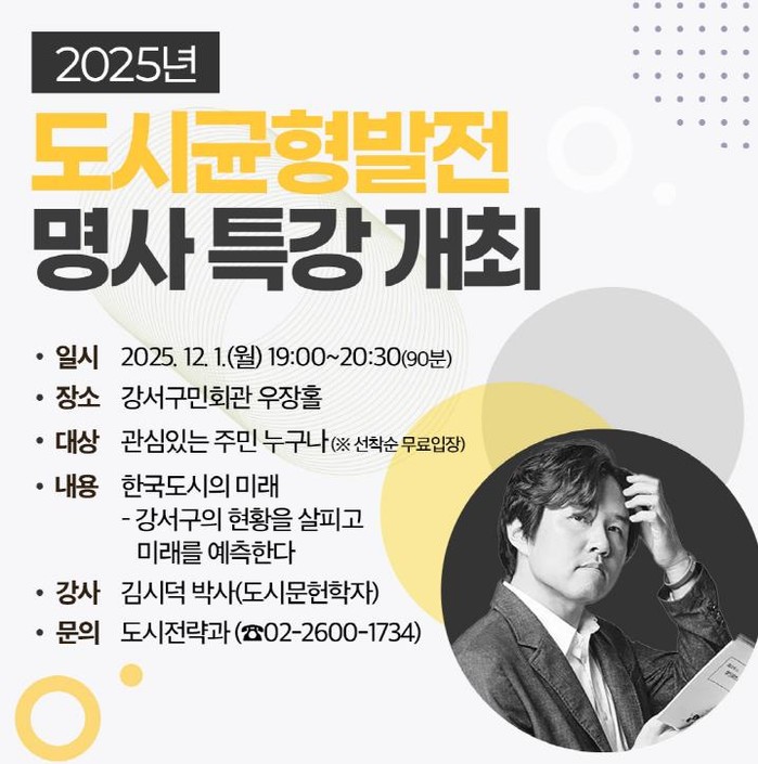 이번 특강은 12월 1일 오후 7시부터 8시 30분까지 강서구민회관(우장산로 66) 우장홀에서 열린다. 관심 있는 주민 누구나 선착순으로 무료 참여할 수 있다.