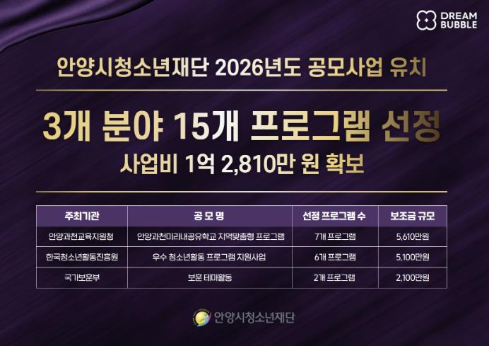 [파이낸셜경제=김기보 기자] 안양시청소년재단은 2026년 국가 및 공공기관, 교육청 등이 추진하는 주요 공모사업 3개 분야에서 15개 프로그램이 선정되어 총 1억 2,810만 원 규모의 사업비를 확보했다고 3일 밝혔다.