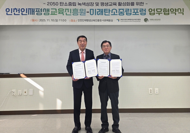 [파이낸셜경제=김기보 기자] 2025년 11월 10일, 인천인재평생교육진흥원과 미래탄소중립포럼이 탄소중립 시민교육과 평생교육 활성화를 위한 업무협약(MOU)을 체결했다.