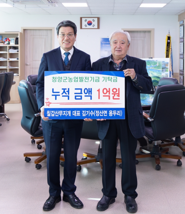 [파이낸셜경제=김영란 기자] 청양군은 정산면 용두리 소재 ‘칠갑산무지개’의 김기수 대표가 군청을 방문해 농업발전기금 1,000만 원을 기탁하면서 올해로 마침내 누적 기탁금 1억 원을 달성했다고 밝혔다.