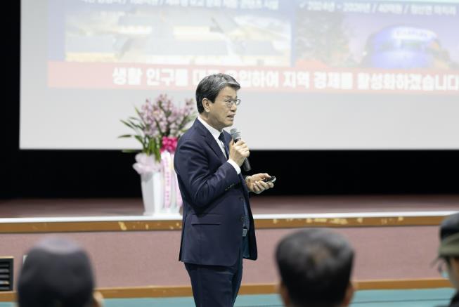 | ▲ 2026년 읍‧면 연두순방에서 김돈곤 군수가 군민들에게 군정 주요 성과 보고를 하고 있다. |