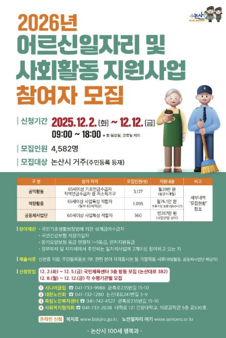 [파이낸셜경제=김영란 기자] 논산시는 2026년도 어르신일자리 및 사회활동 지원사업 참여자를 오는 12월 2일부터 12일까지 모집한다고 밝혔다.