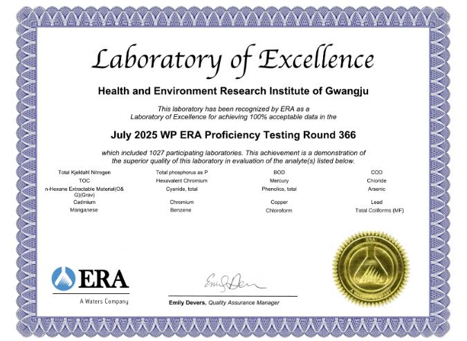 [파이낸셜경제=김예빈 기자] 광주광역시 보건환경연구원이 최근 미국 환경자원협회(ERA)가 주관한 수질분야 국제 숙련도시험에서 전 항목 ‘만족(Satisfactory)’ 판정을 받아 ‘2025 최우수 분석기관(Laboratory of Excellence)’으로 선정됐다.