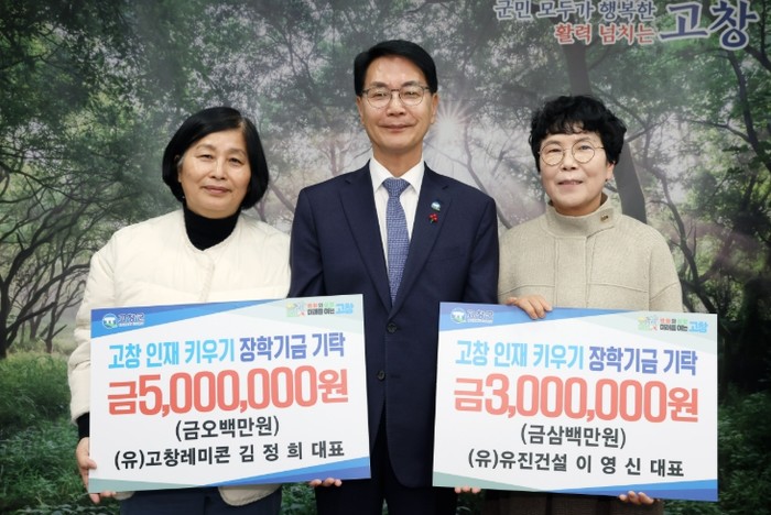 19일 고창군장학재단에 따르면 이날 고창친환경블루베리연구회(회장 백석기)에서 200만원, 성송면 이성진씨 100만원, ㈜고창레미콘 김정희 대표 500만원, ㈜유진건설 이영신 대표 300만원을 각각 기탁하며 지역 인재 육성에 뜻을 모았다.