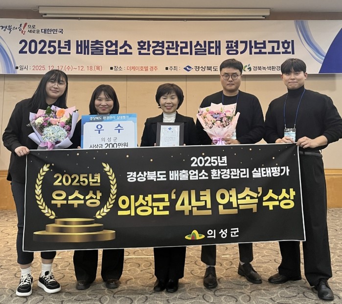 [파이낸셜경제=김지훈 기자] 의성군은 지난 12월 17일 열린 ‘2025년 경상북도 배출업소 환경관리 실태평가’에서 2그룹 1위를 차지하며 도 전체 우수상을 수상했다고 밝혔다.