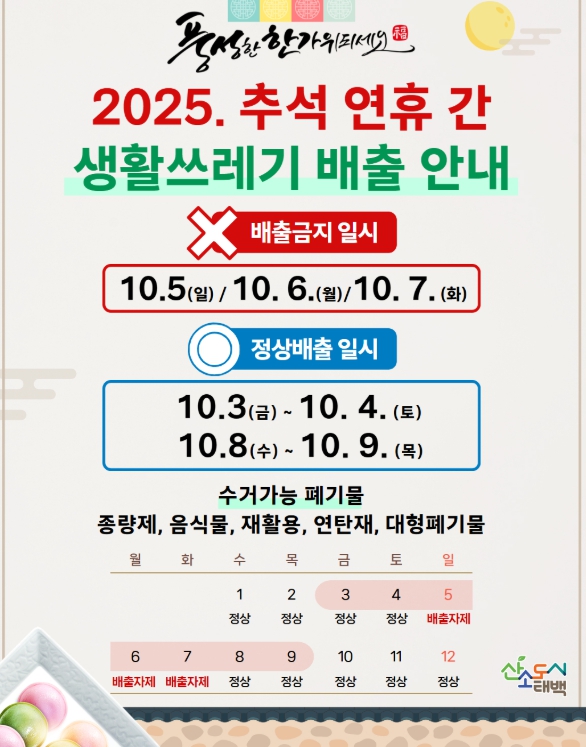 태백시 관계자는 “시민 여러분의 작은 협조가 더 깨끗한 명절을 만드는 힘이 된다”며 “생활폐기물은 3·4일과 8·9일 정상 수거가 이뤄지니 반드시 기억해 주시기 바란다”고 말했다.