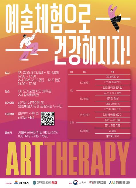 [파이낸셜경제=조성환 기자] 삼척시는 가톨릭관동대학교 RISE 사업단과 협력하여 지역 자연자원을 활용한 ‘융합예술치유 프로그램’을 오는 12월 도계고등학교 체육관과 삼척체육관에서 개최한다.