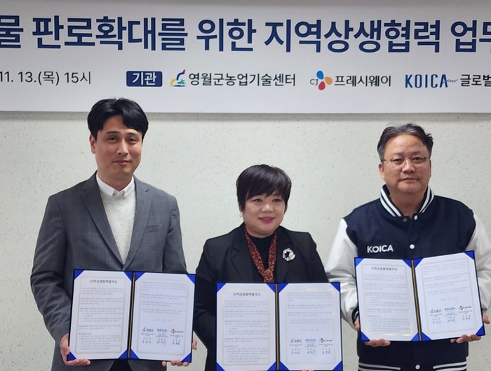 [파이낸셜경제=조성환 기자] 영월군농업기술센터는 2025년 11월 13일 목요일 오후 3시, 영월군농업기술센터 2층 회의실에서 CJ프레시웨이, KOICA글로벌인재교육원과 함께 지역상생협력 업무협약을 체결했다.
