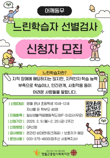 [파이낸셜경제=조성환 기자] 영월군종합사회복지관은 학습과 일상생활에서 어려움을 겪는 아동을 조기에 발견하고 적절한 지원 방향을 모색하기 위해 느린학습자 선별검사 신청자를 모집한다고 밝혔다.