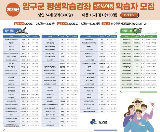 수강 신청은 이달 26일부터 2월 6일까지 가능하며 1인당 최대 3개 강좌까지 신청할 수 있다. 신청은 양구군 평생학습관 홈페이지를 통한 온라인 접수로 진행되며, 학습자는 2월 10일 오전 10시 전자 추첨을 통해 선정된다.