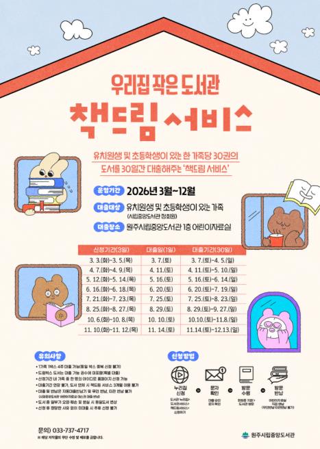 [파이낸셜경제=조성환 기자] 원주시립중앙도서관은 3월부터 우리집 작은도서관 ‘책드림 서비스’를 운영한다.