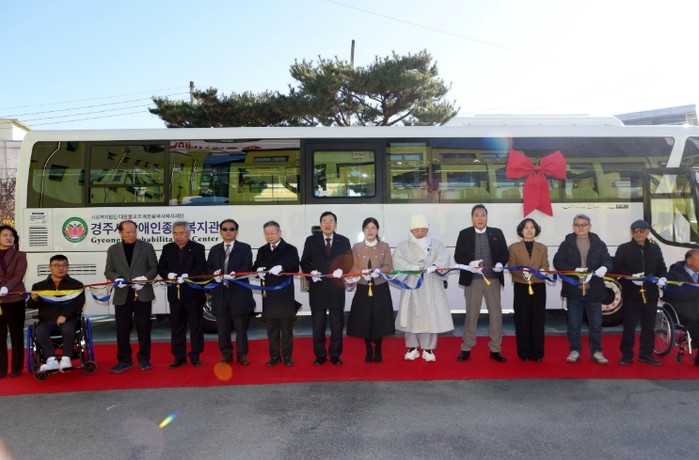 | ▲ 주낙영 경주시장(가운데)과 내빈들이 장애인종합복지관 특장버스 도입을 기념하며 테이프 커팅을 진행하고 있다. |